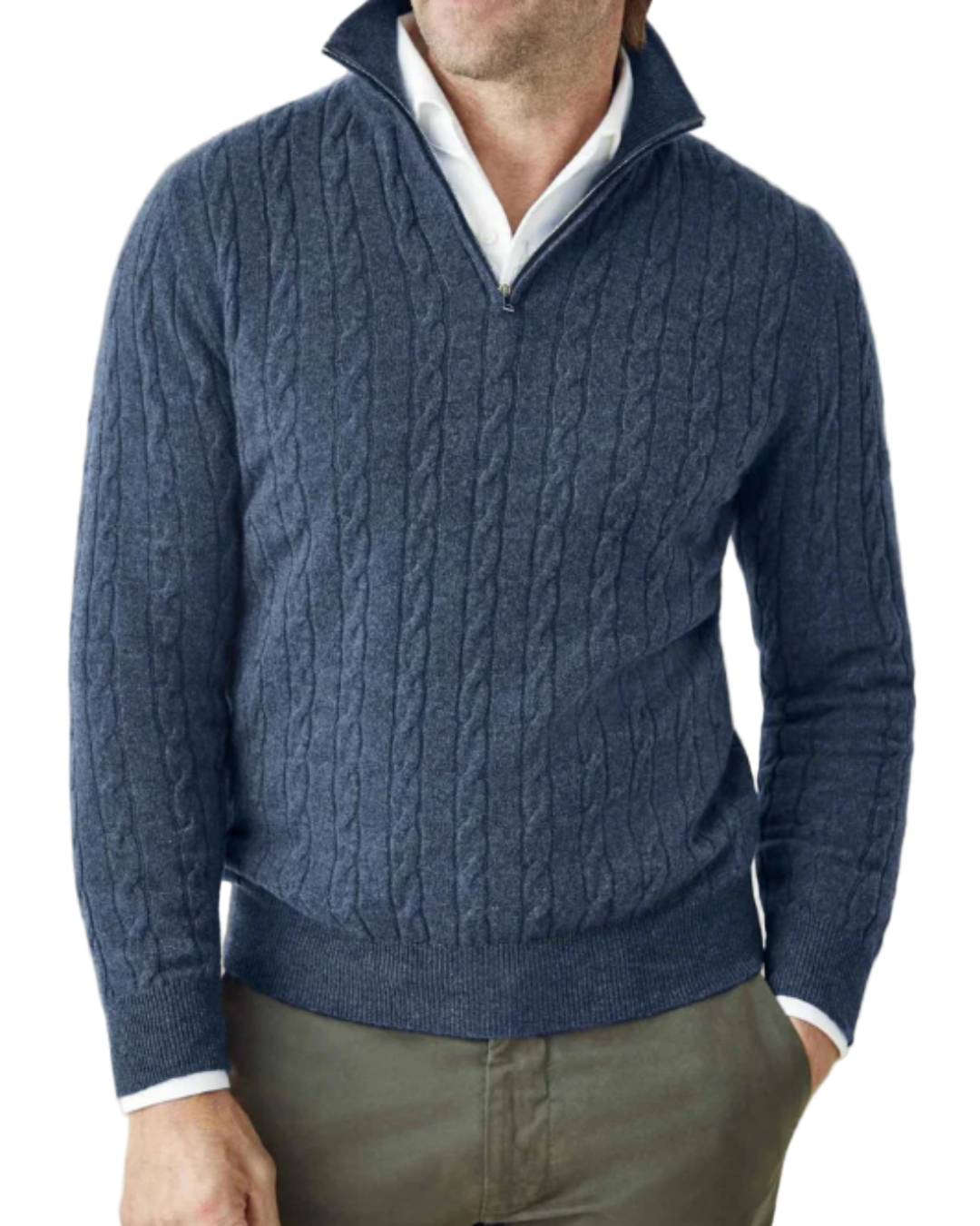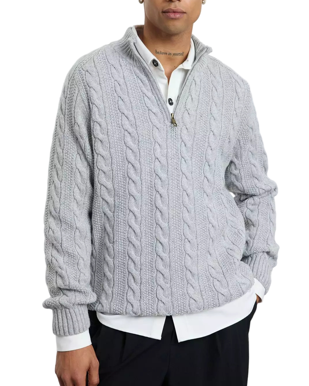 Men's Cable Knit Quarter Zip Sweater with Mock Neck Collar