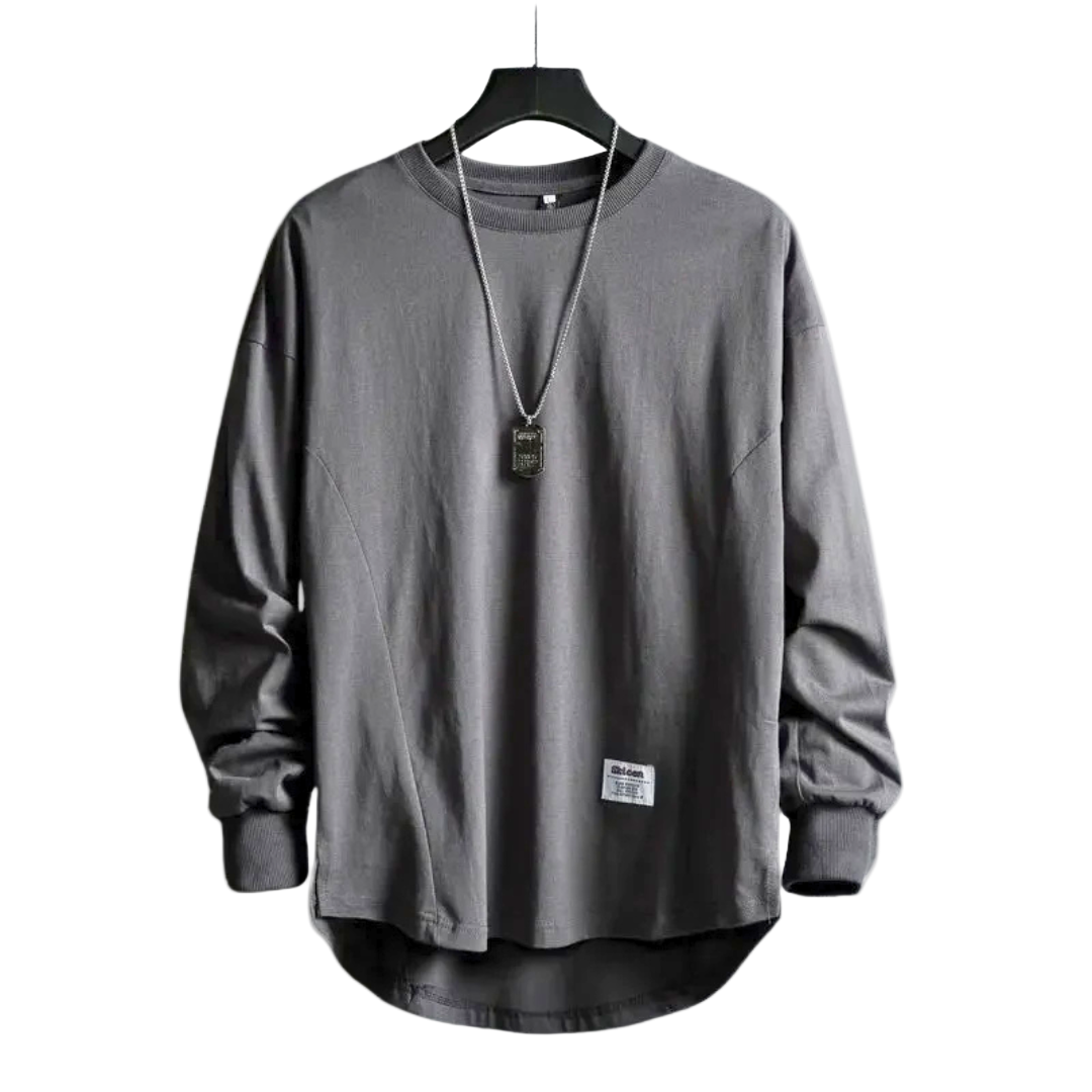Men's Long Sleeve Crew Neck Sweater with Drop Hem and Label Patch