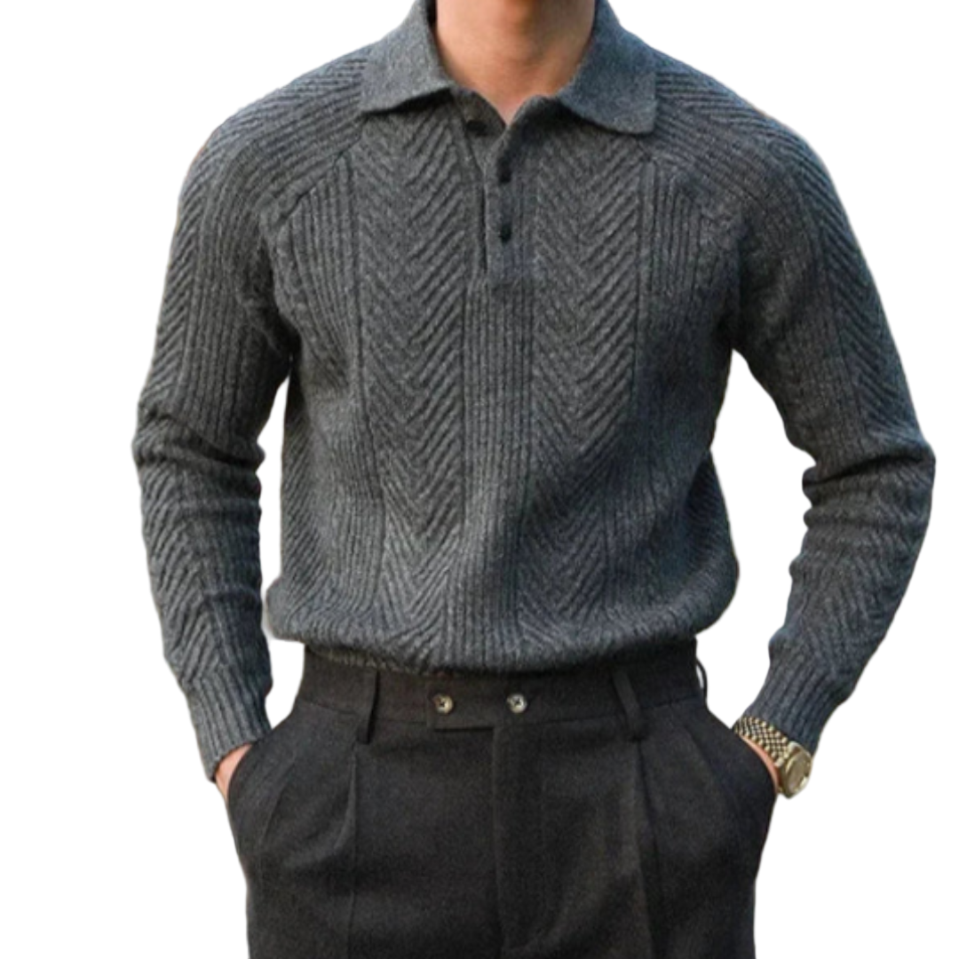 Men's Polo Sweater with Chevron Knit Pattern and Button Placket
