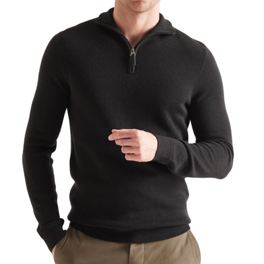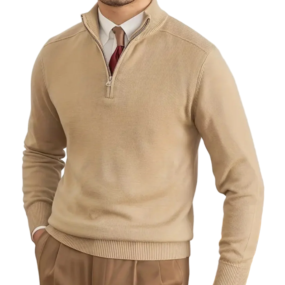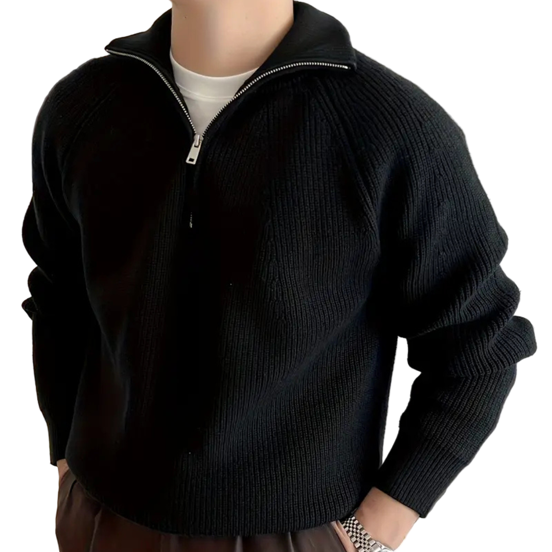 Men's Quarter Zip Sweater with Ribbed Stand Collar and Long Sleeves