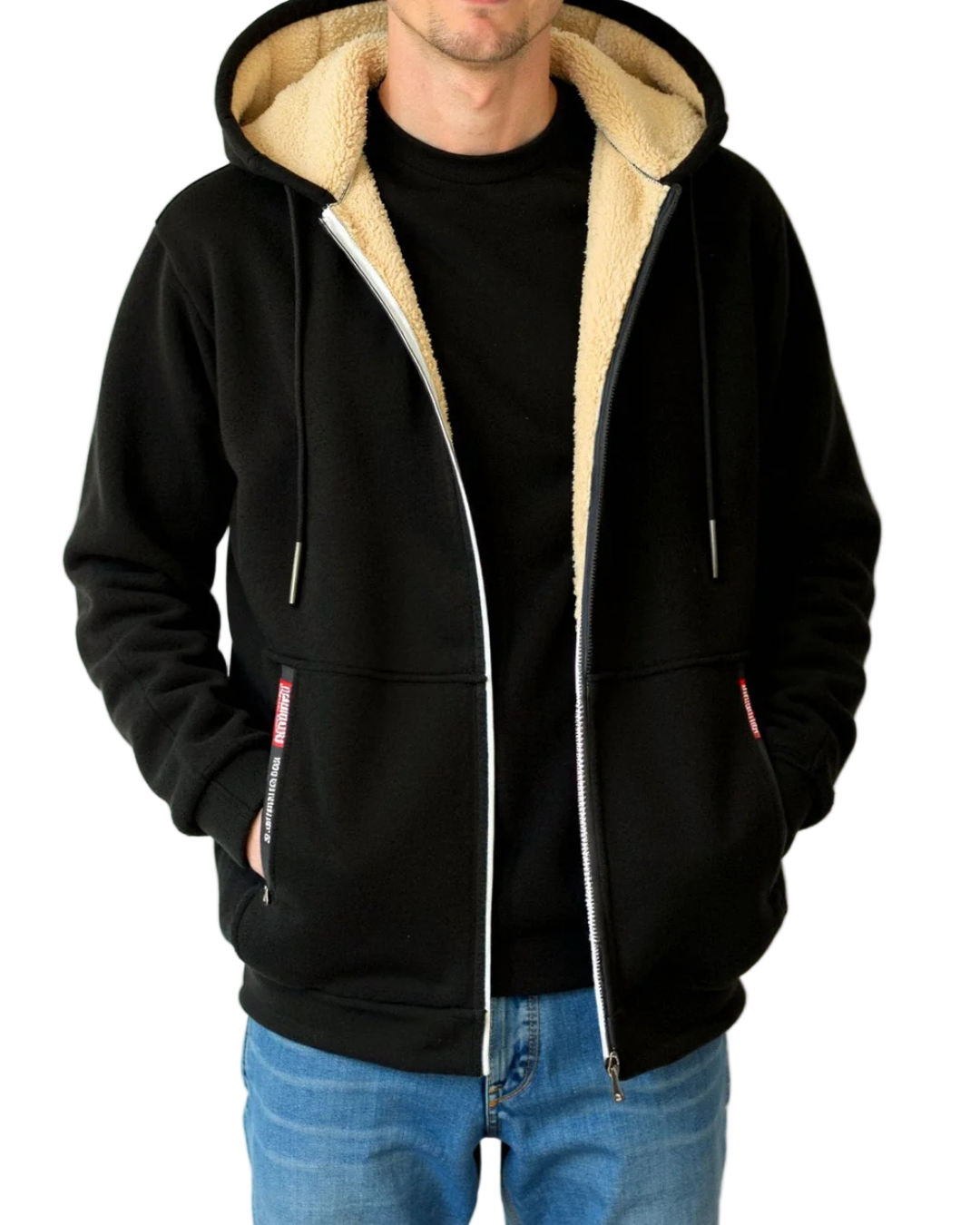 Men's Sherpa Lined Zip Hoodie with Drawstring Hood and Side Pockets