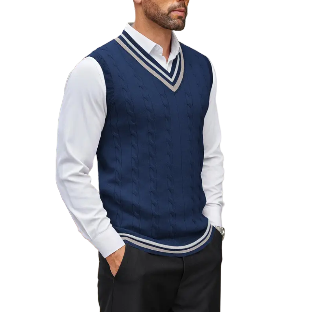 Men's Sleeveless Knit Sweater Vest with V Neck and Striped Trim