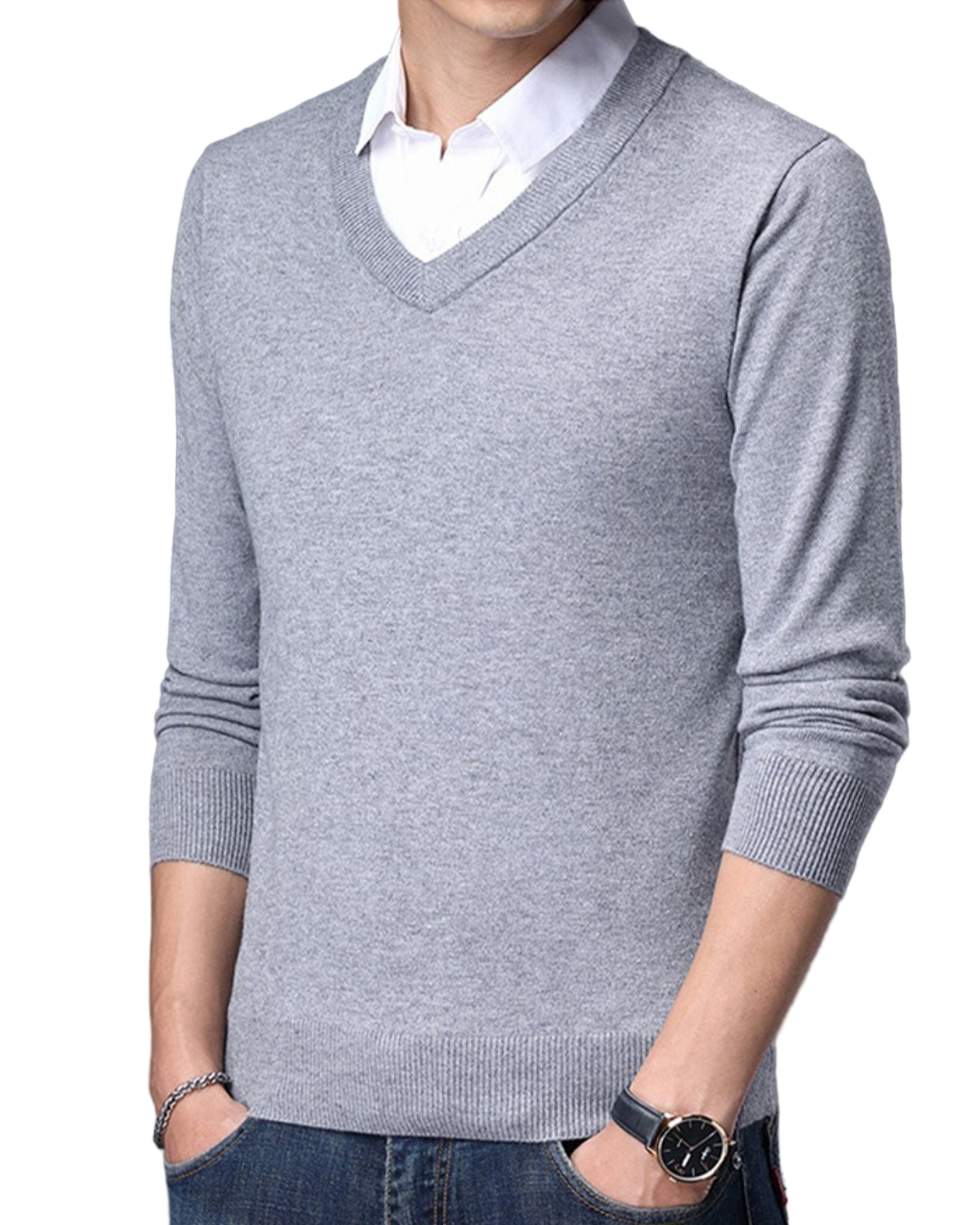 Men's V-Neck Sweater with Ribbed Trim and Long Sleeves