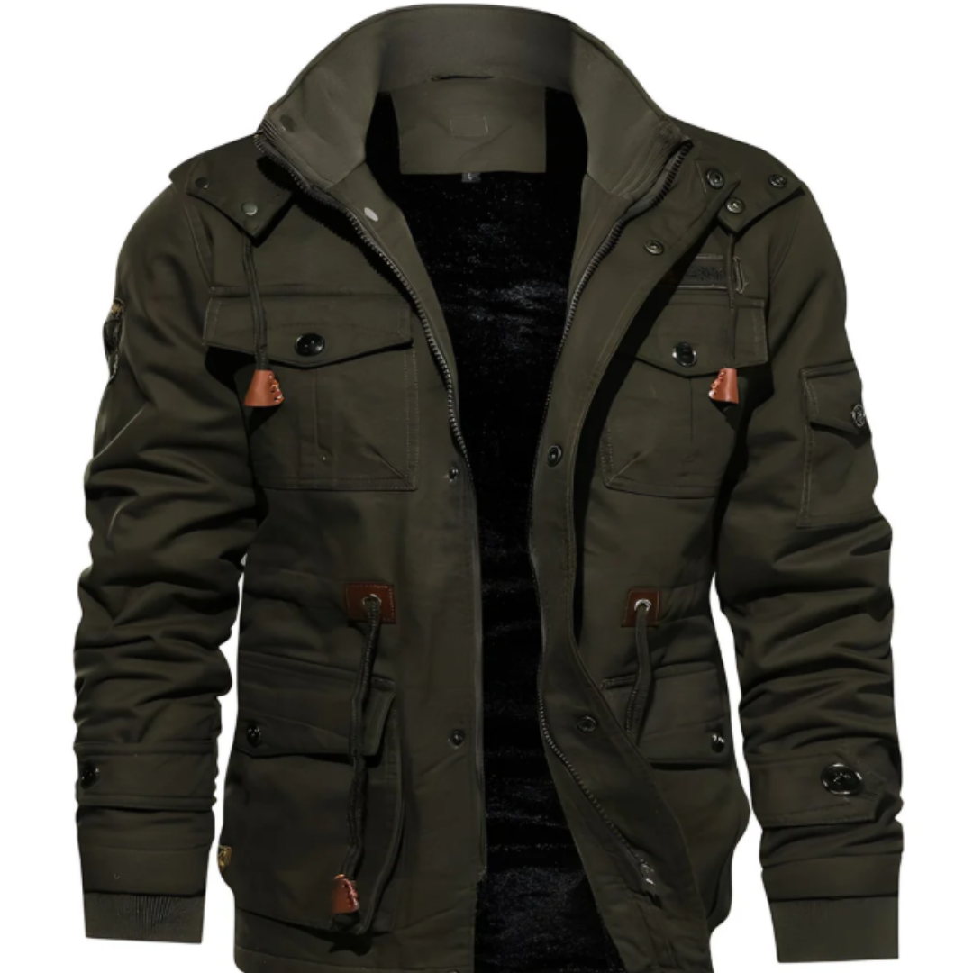 Men's Military Field Jacket with Multiple Cargo Pockets and Stand Collar
