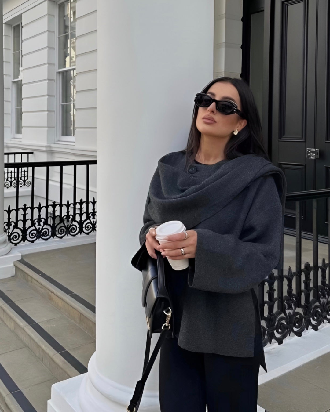 Women's Cape Jacket with Draped Cowl Neck and Button Closure