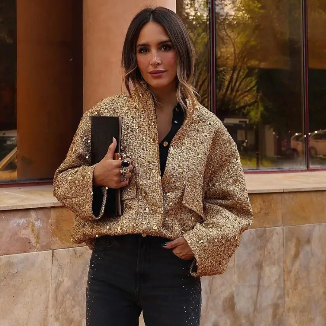 Women's Sequin Bomber Jacket with Zip Front and Ribbed Trim