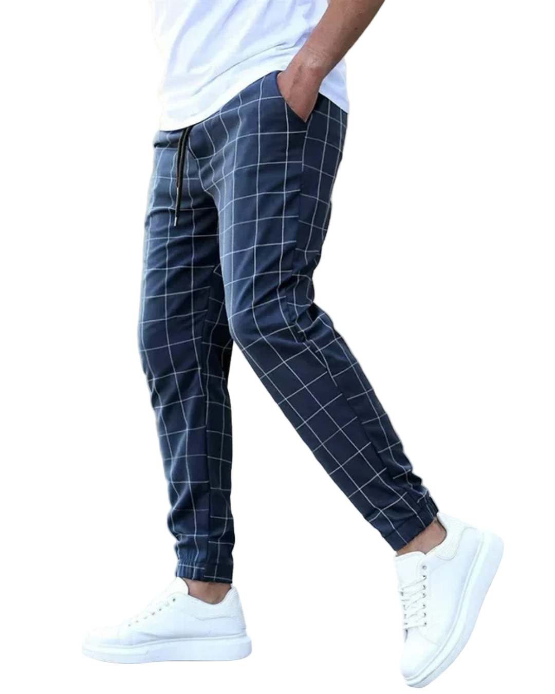 Men's Windowpane Check Jogger Pants with Elastic Waist and Ankle Cuffs
