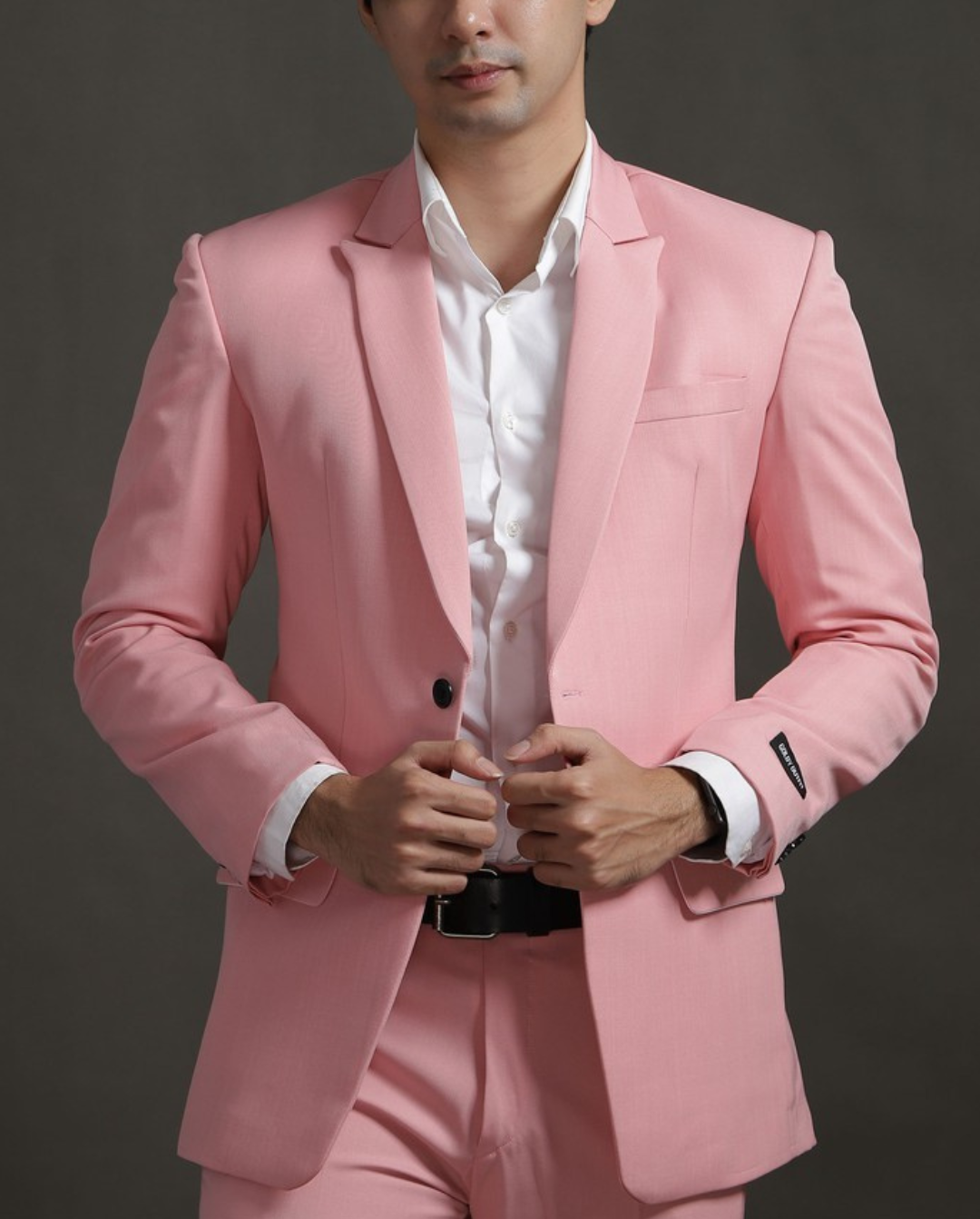 Men's two-piece suit set including single-breasted blazer with notch lapel collar and matching flat front pants. Blazer features two-button front closure with welt chest pocket and two front flap pockets. Pants include zip fly closure with button waist and belt loops.