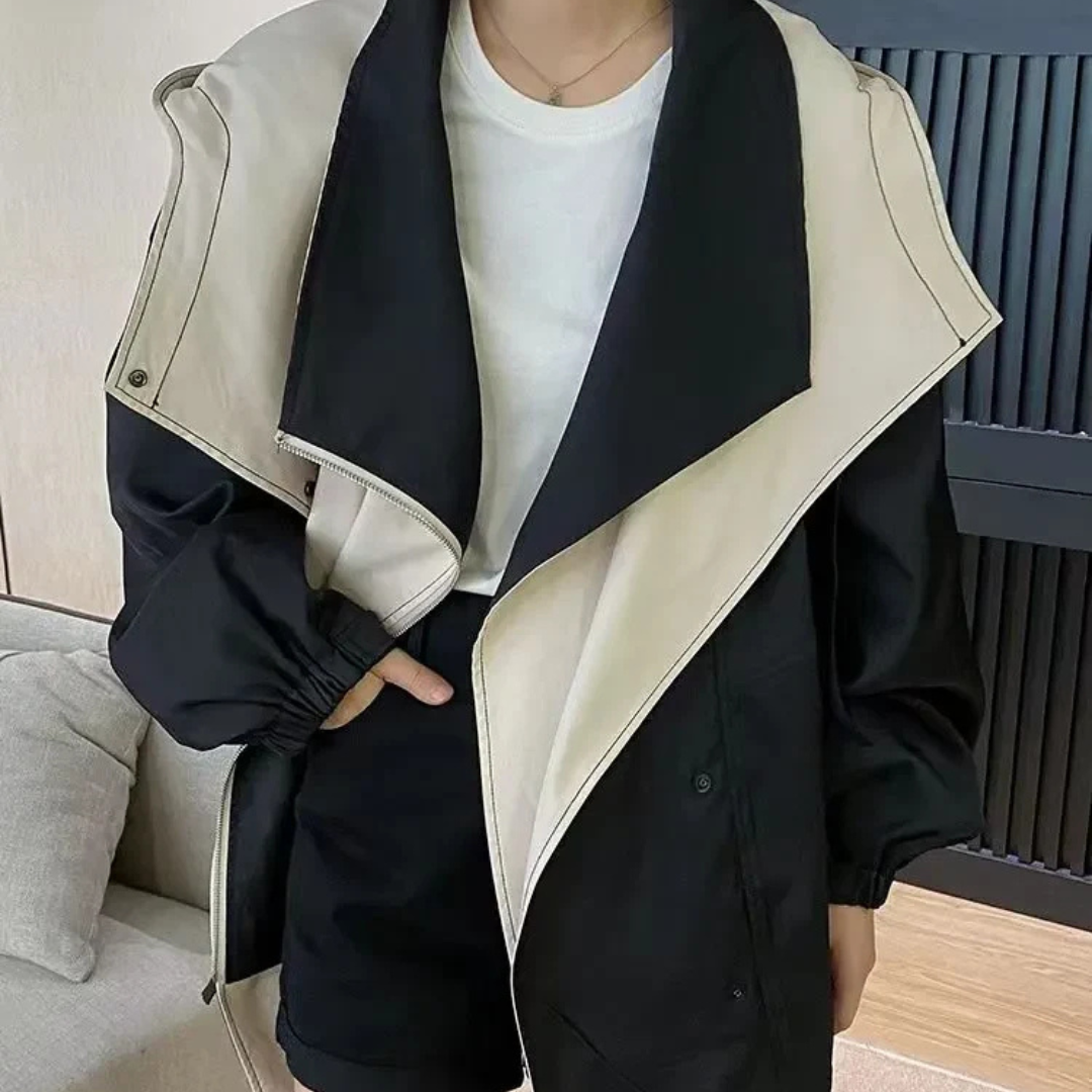 Women's Color Block Trench Coat with Wide Collar and Button Front Closure
